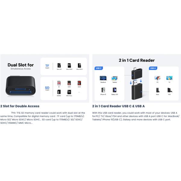 Dual Slot Design: Supports both SD and microSD cards (UHS-I) or (UHS-II), allowing simultaneous reading of both formats.